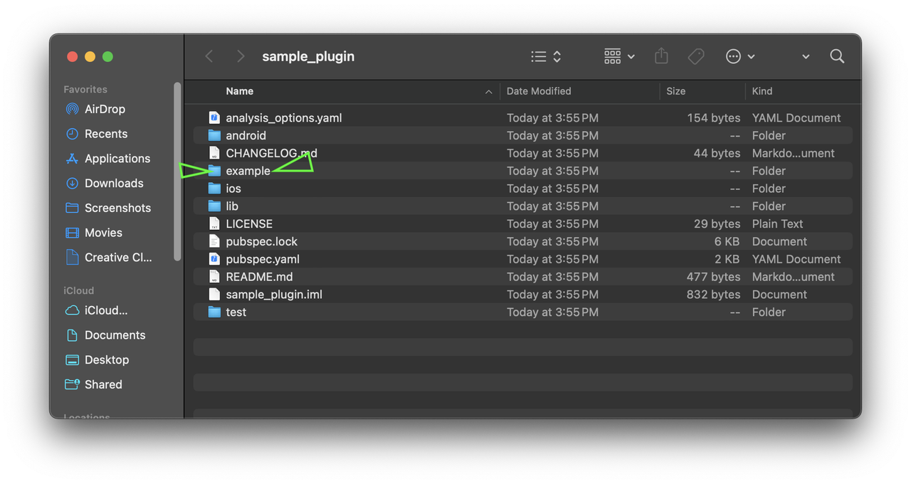 The example/ directory contains a simple Flutter application that depends on the created sample_plugin. Let's check out the pubspec.yaml file: